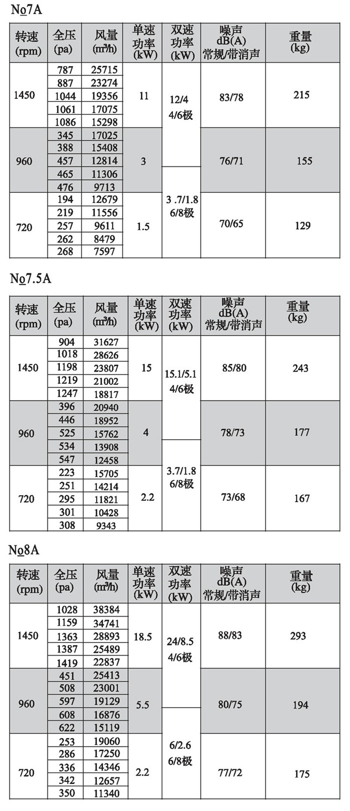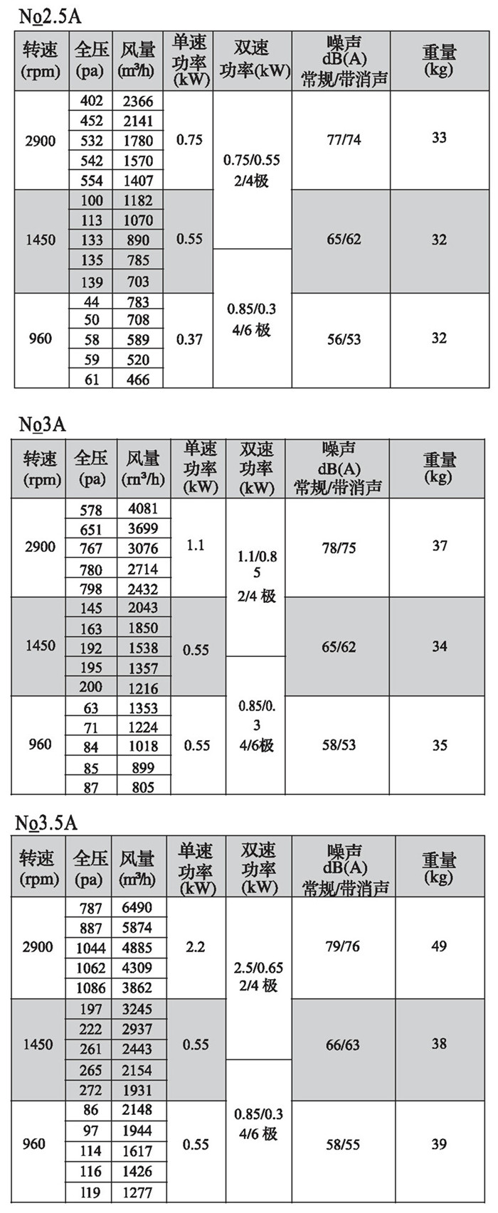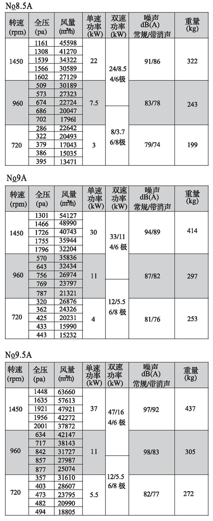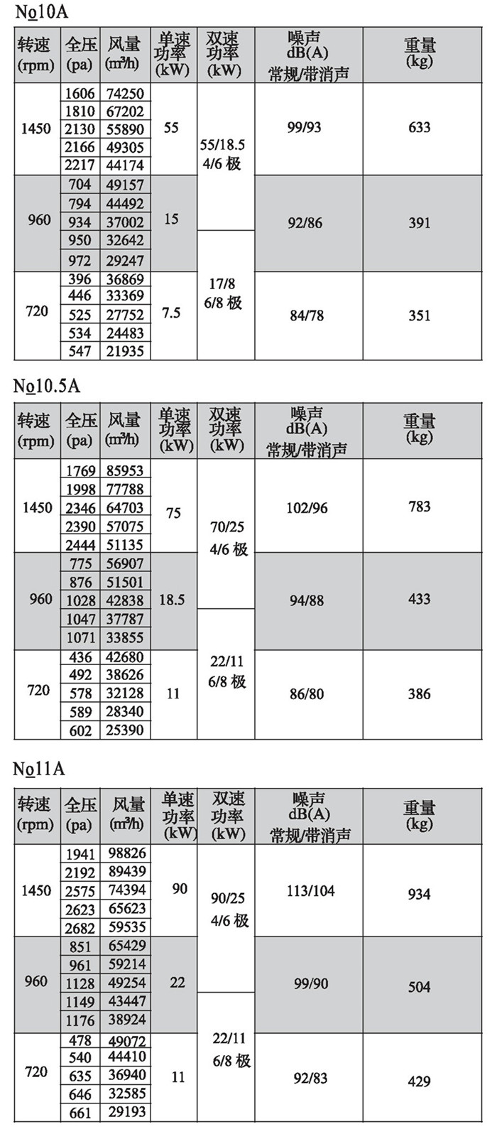 注:双速风机重量参考同号中高速风机的重量。